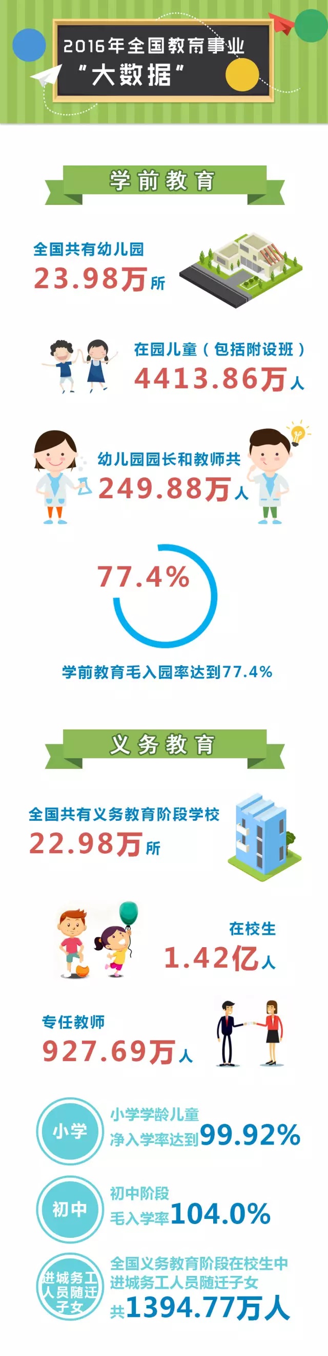 近日,教育部发布《2016年全国教育事业发展统计公报》。2016年,全国共有多少所幼儿园?义务教育阶段的学校有多少所?有多少所高中?普通高等学校和成人高等学校的数量是多少?这些学校里有多少老师和学生?小编带你一张图读懂2016年教育事业大数据!