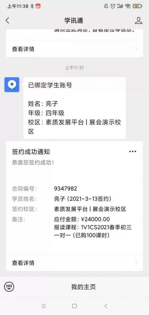 完成签署的合同会自动推送到学讯通公众号,家长可以随时查阅或下载到自己手机。