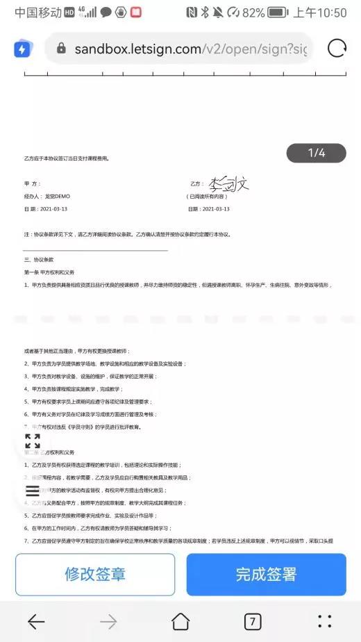 家长点进短信链接完成身份认证、支付请求并签名三个步骤就能收到同样具有法律效力的合同原件链接了。
