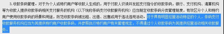 央行在10月份发布的《关于加强支付受理终端及相关业务管理的通知》中对个人收款码和特约商户收款码做了一个区分:禁止个人收款码的商用,但具有明显经营活动特征的个人和具有营业执照等相关资证的商户所使用的特约商户收款条码是没被禁止的。