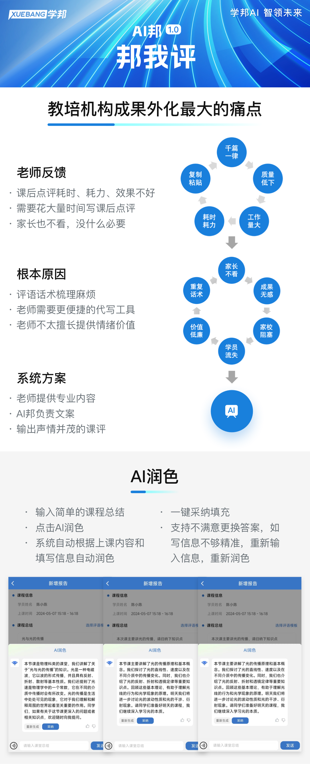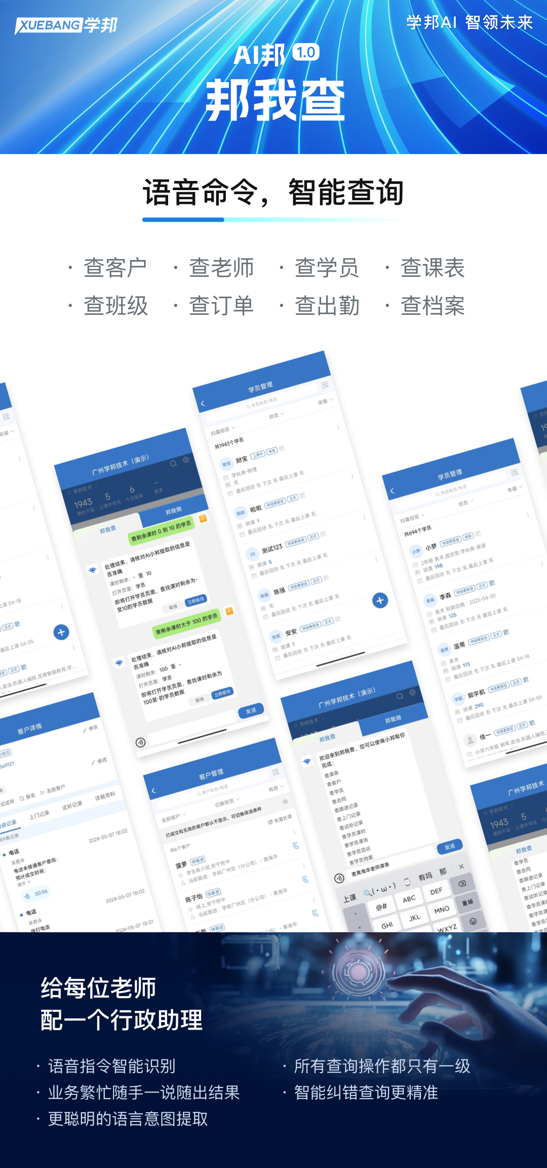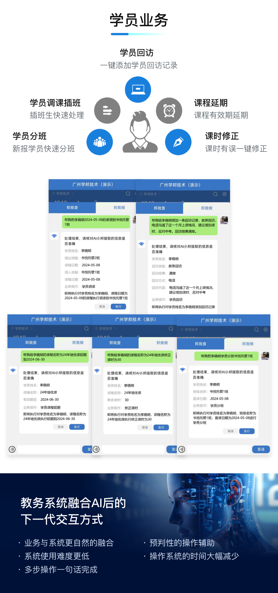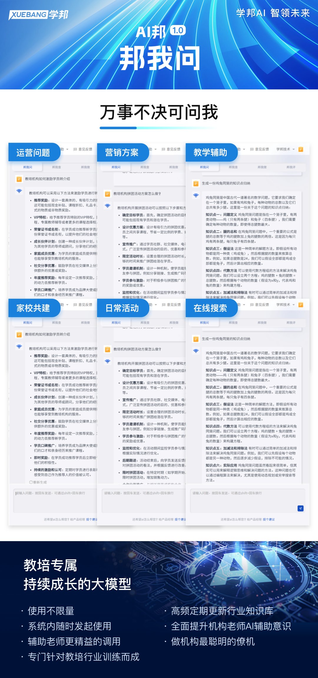5月16日,学邦技术再一次引领行业,发布教培行业教务管理系统AI落地应用功能 – AI邦,1.0版本包括邦我问、邦我查、邦我做、邦我评四大功能助力机构快速进入AI时代,用AI赋能教育机构发展!