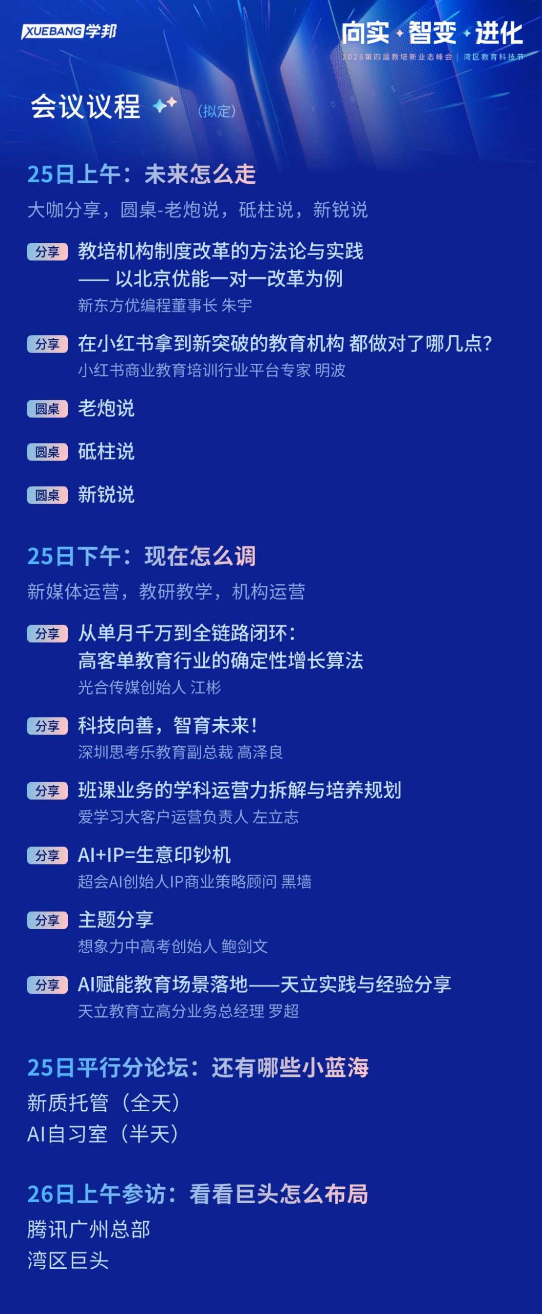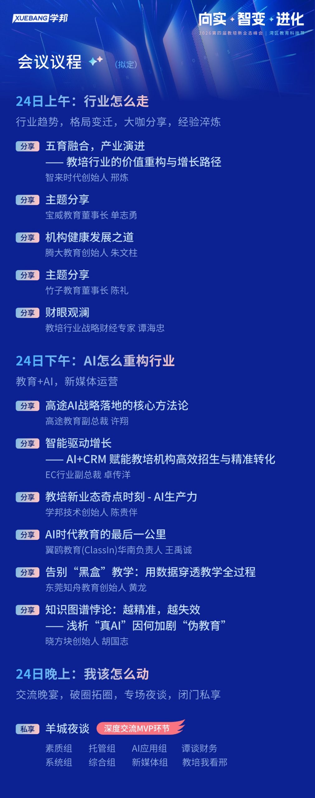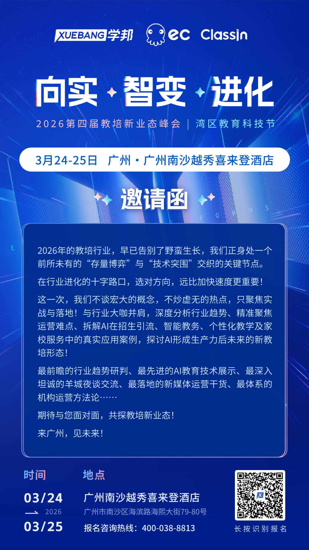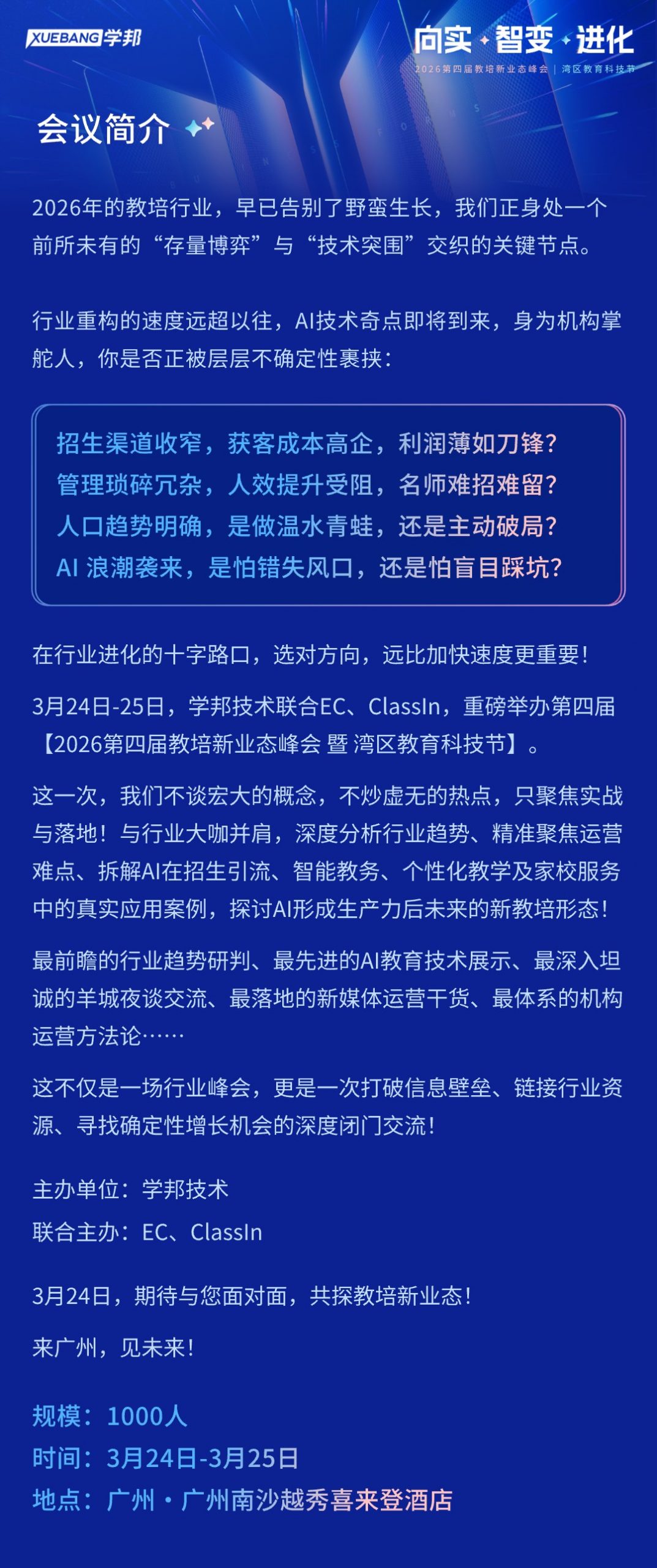 3月24日-25日,学邦技术联合六度人和(EC)、翼鸥教育(ClassIn),在广州重磅举办第四届【2026第四届教培新业态峰会 暨 湾区教育科技节】!
