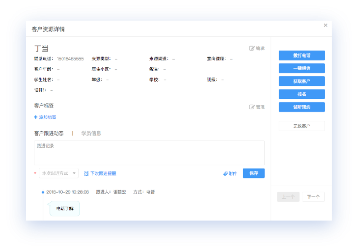 通过学邦技术|BOSS系统的客户管理功能进一步对通过电服宝签约的客户管理跟进,可实现一键导入资源,一键分配销售;客户自动分类,客户的跟进、预约记录,定时提醒课程顾问跟进客户;对通话内容进行统计,并永久保存通话录音。