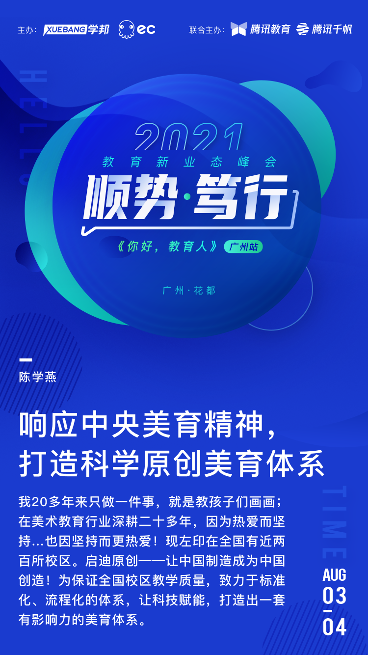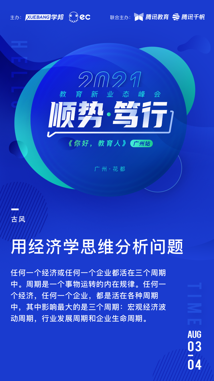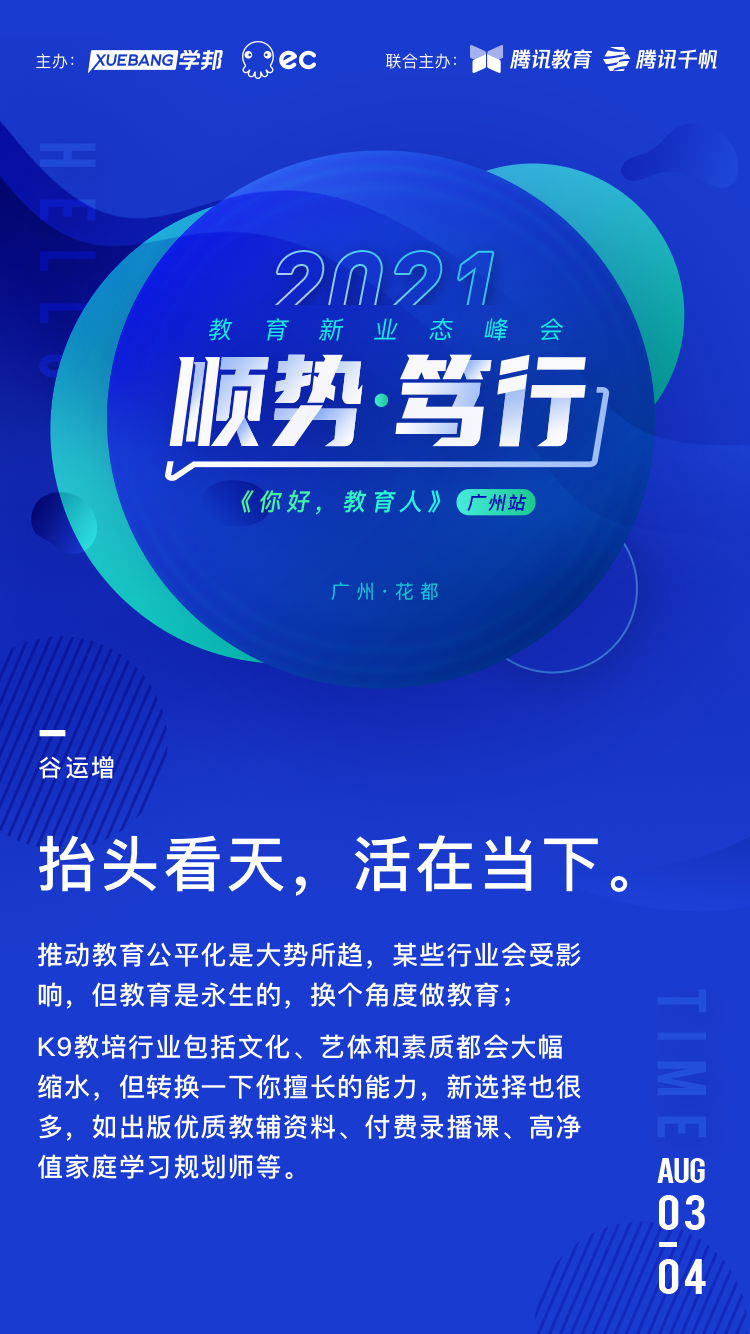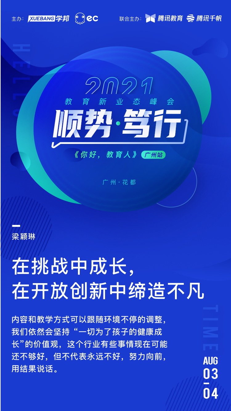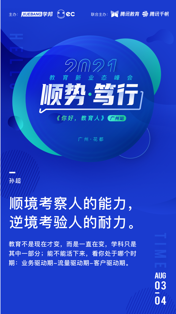 此次峰会由学邦技术联合EC、腾讯教育共同举办,主题为顺势•笃行,旨在探索如何顺应时势,把握好行业转折点,选对赛道,笃定前行!