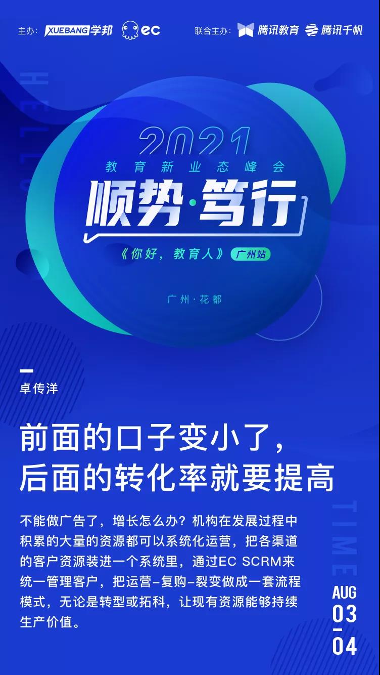 紧接着是EC CRM教培行业副总裁卓传洋卓总,分享了主题为《新政后的成交与复购—CRM数字化经营驱动机构业绩提升》的演讲。
