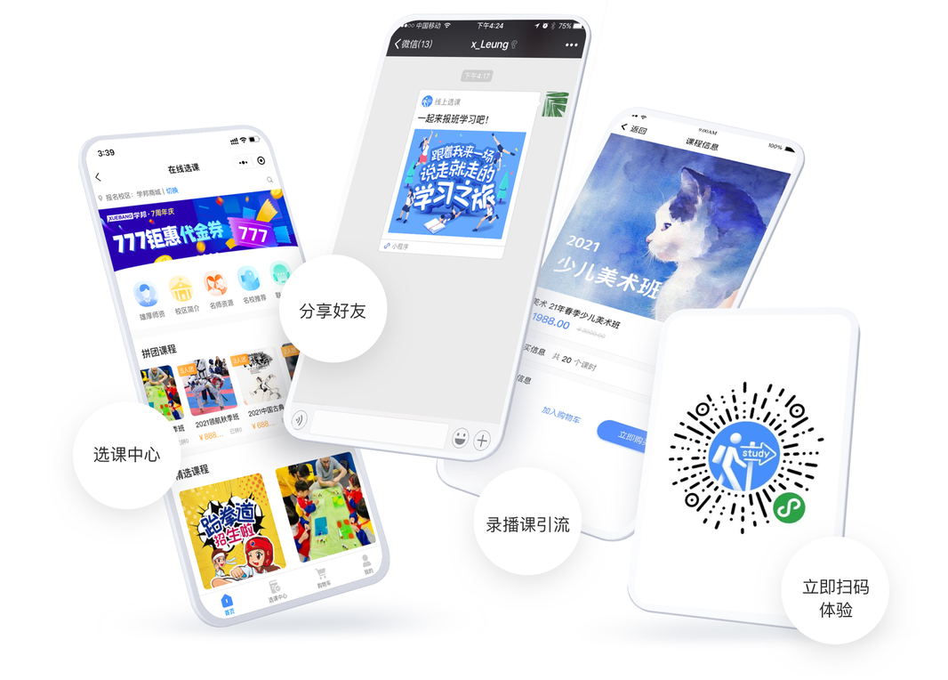 · 自动生成专属转介绍二维码,新学员通过扫码成功注册即可获得积分、优惠券、